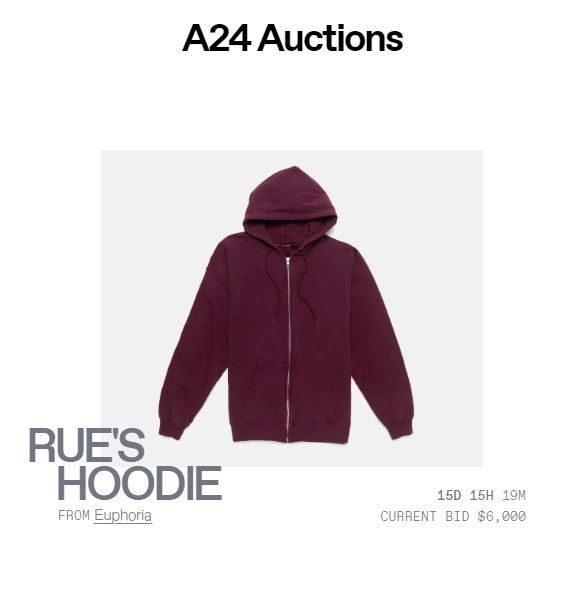 Auction site A24 is selling Zendaya’s purple hoodie from her HBO hit Series “Euphoria. Rue’s hoodie joins other items including the Time Capsule and Gabe’s Pool Goggles from “Eighth Grade”, the Charles and Annie Heirloom Doormats from “Hereditary” and Stevie’s Skateboard from “Mid90s”.